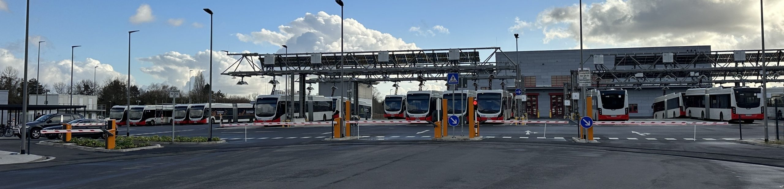 Die Kölner Verkehrs-Betriebe (KVB) haben in Köln-Porz einen neuen Betriebshof auf einem etwa 63.000 Quadratmeter großen Areal, also auf etwa neun Fußballfeldern, fertiggestellt. Auf dem Betriebshof werden perspektivisch über 100 Elektrobusse ihre „neue Heimat“ finden. Platz wird es für 150 – 180 Fahrzeuge geben. Die Fahrzeuge werden hier nach ihrem Linieneinsatz abgestellt, über die Ladeinfrastruktur mit Ökostrom versorgt, gewaschen und gewartet. Der neue Betriebshof wurde von hermetec mit 620 m Sicherheitszaun eingefriedet. 2 automatische Schiebetore mit 4 Flügeltoren kamen zur Ausführung. Für die PKW und LKW (Bus) Vereinzelung wurden 6 automatische Schrankenanlagen, angesteuert mit Weitbereichslesern, verbaut. Zur besseren Wahrnehmung der Schranke wurden die Schrankenbäume mit Baumbeleuchtung und Ampelsteuerungen ausgestattet.
